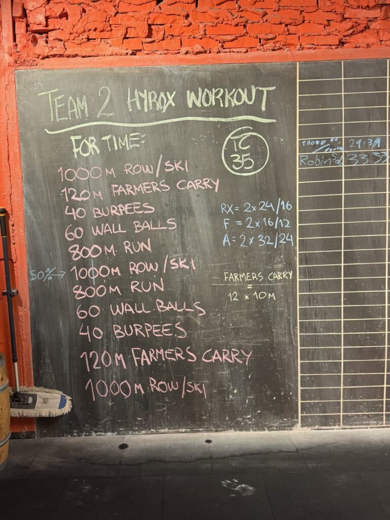 Vi er ikke et Hyrox gym, men vi hyroxer jo litt hele tiden. så for å presisere kaller vi av og til øktene «Hyrox» De samme øktene vi før bare kalte «hopp og sprett Torsdag»